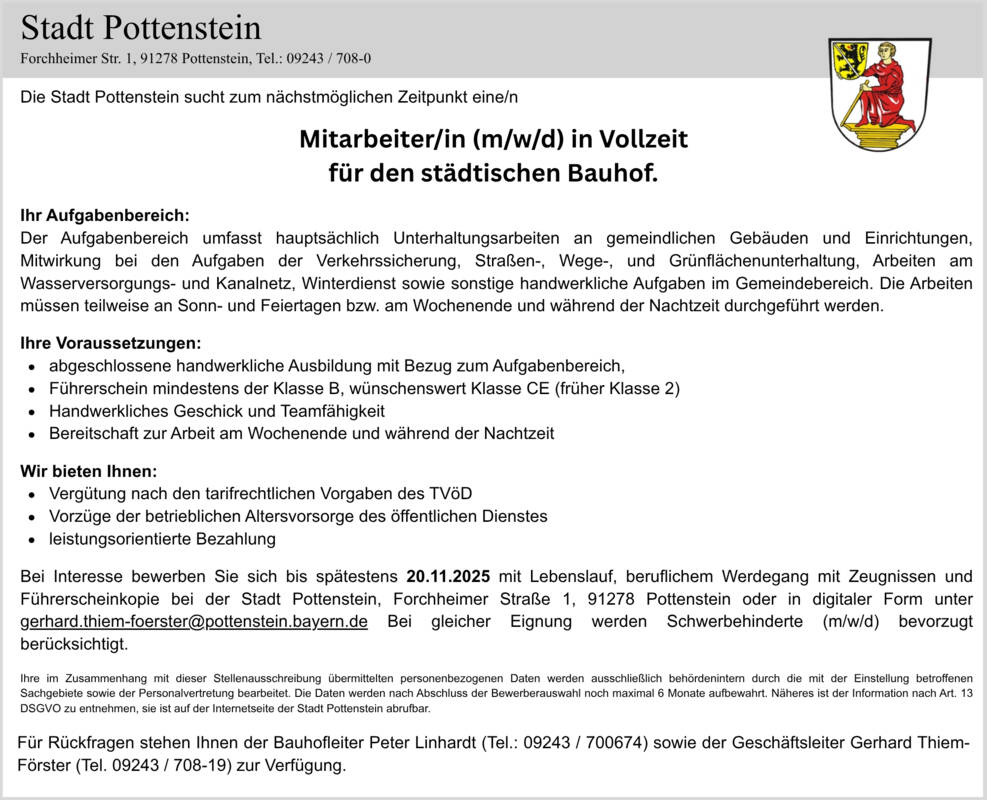 Stellenausschreibung: Bauhofmitarbeiter (m/w/d) in Vollzeit gesucht!